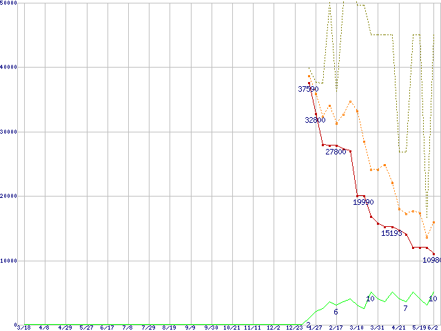 ※このグラフは過去のデータも税率5%相当に調整した税込み相当額のグラフです。 税率変更や、総額表示方式導入(2004年4月)の影響は除いています。 | | | ●凡例 | 最安値 (点線部は販売店未確認 または未調査) | 平均値 | 最高値 | ショップ数 |