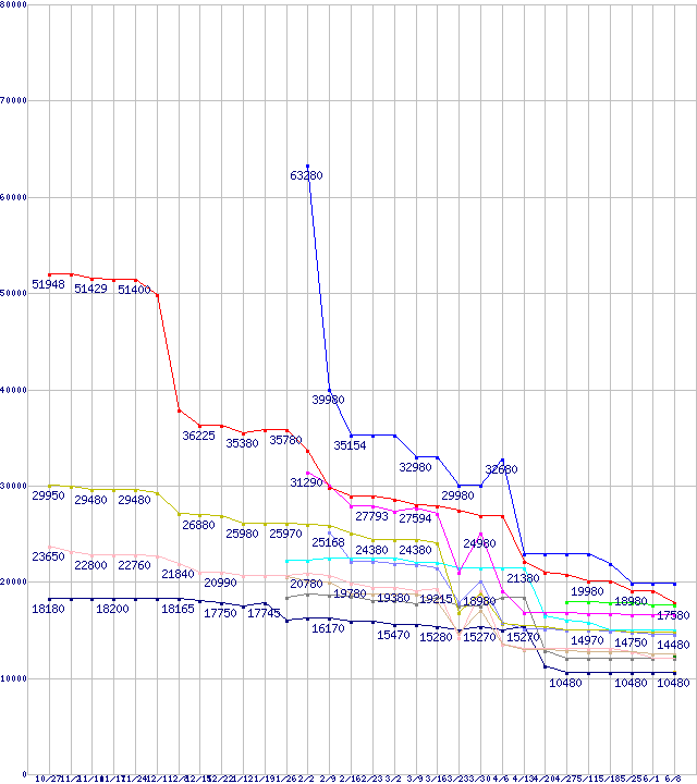 | CPU主要製品(最安値1万円~2万円未満)の最安値推移 | | | (2006年10月27日~2007年6月8日) |