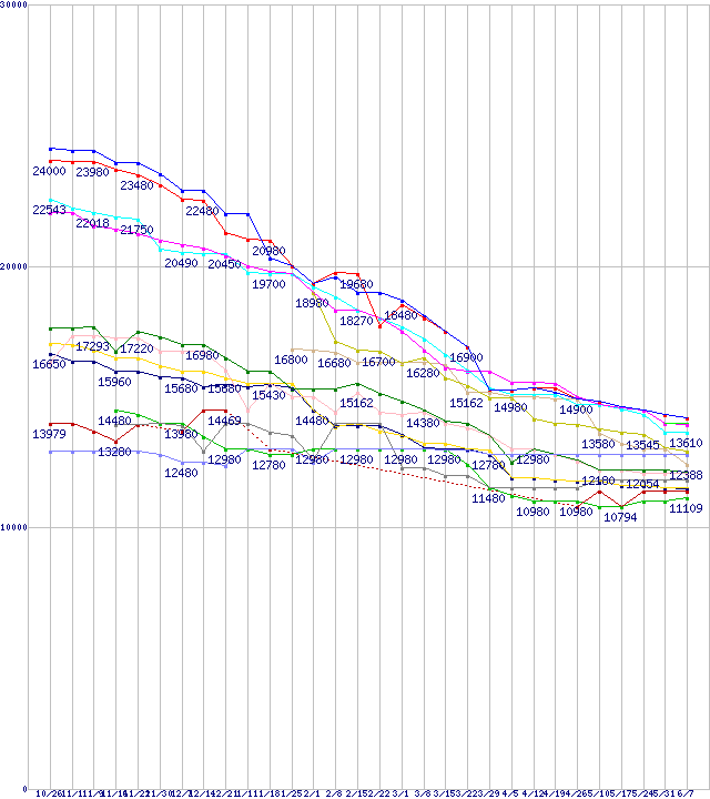 | HDD主要製品(最安値1万円~1万5千円未満)の最安値推移 | | | (2006年10月26日~2007年6月7日) |