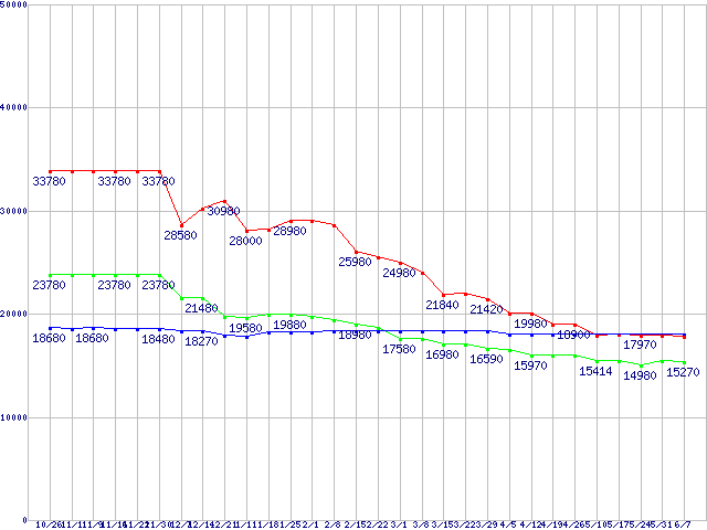 HDD主要製品(最安値1万5千円~2万円未満)の最安値推移