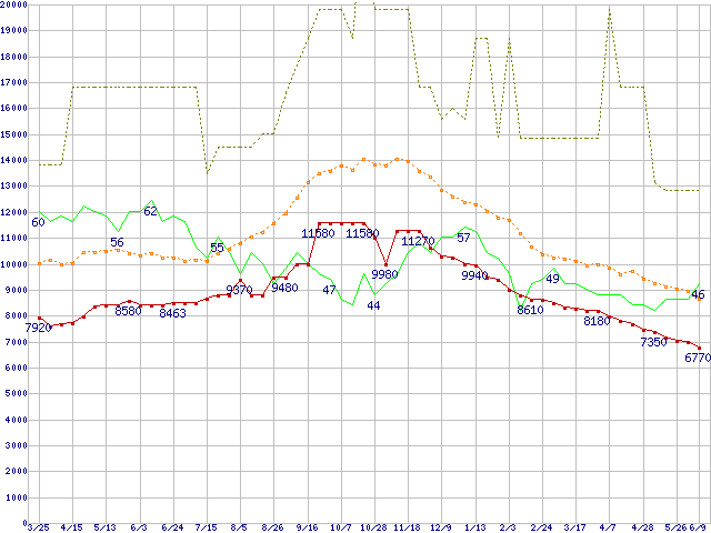 ※このグラフは過去のデータも税率5%相当に調整した税込み相当額のグラフです。 税率変更や、総額表示方式導入(2004年4月)の影響は除いています。 | | | ●凡例 | 最安値 (点線部は販売店未確認 または未調査) | 平均値 | 最高値 | ショップ数 |