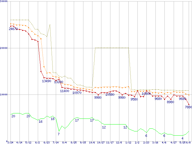 | Athlon 64 3500+ (2.2GHz,L2 512KB,Socket 939)の価格推移 | | | (2006年3月24日~2007年6月8日) |