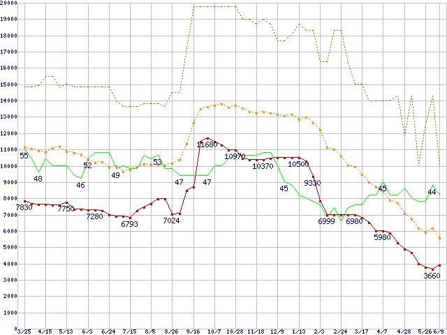 ※このグラフは過去のデータも税率5%相当に調整した税込み相当額のグラフです。 税率変更や、総額表示方式導入(2004年4月)の影響は除いています。 | | | ●凡例 | 最安値 (点線部は販売店未確認 または未調査) | 平均値 | 最高値 | ショップ数 |