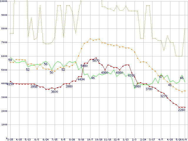 ※このグラフは過去のデータも税率5%相当に調整した税込み相当額のグラフです。 税率変更や、総額表示方式導入(2004年4月)の影響は除いています。 | | | ●凡例 | 最安値 (点線部は販売店未確認 または未調査) | 平均値 | 最高値 | ショップ数 |