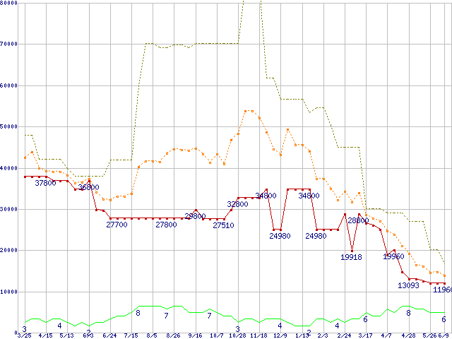 ※このグラフは過去のデータも税率5%相当に調整した税込み相当額のグラフです。 税率変更や、総額表示方式導入(2004年4月)の影響は除いています。 | | | ●凡例 | 最安値 (点線部は販売店未確認 または未調査) | 平均値 | 最高値 | ショップ数 |