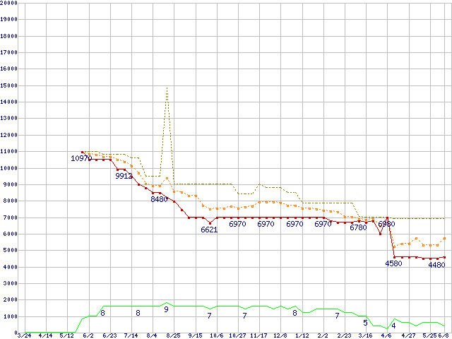 | Sempron 3200+ (1.8GHz,L2 128KB)の価格推移 | | | (2006年3月24日~2007年6月8日) |