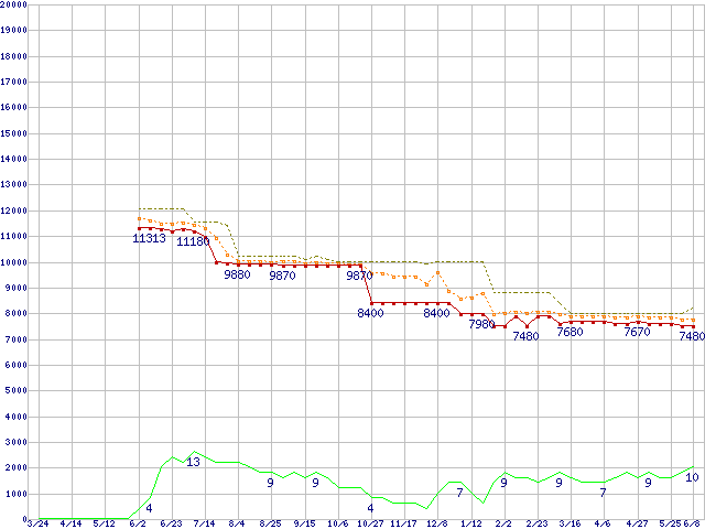 ※このグラフは過去のデータも税率5%相当に調整した税込み相当額のグラフです。 税率変更や、総額表示方式導入(2004年4月)の影響は除いています。 | | | ●凡例 | 最安値 (点線部は販売店未確認 または未調査) | 平均値 | 最高値 | ショップ数 |