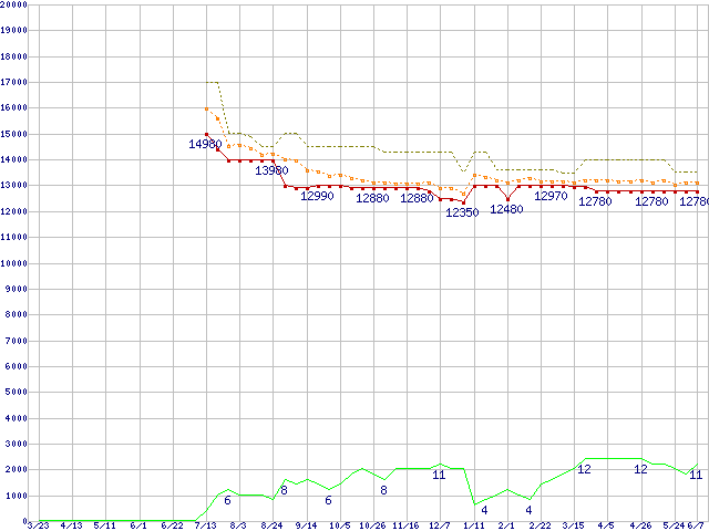 ※このグラフは過去のデータも税率5%相当に調整した税込み相当額のグラフです。 税率変更や、総額表示方式導入(2004年4月)の影響は除いています。 | | | ●凡例 | 最安値 (点線部は販売店未確認 または未調査) | 平均値 | 最高値 | ショップ数 |