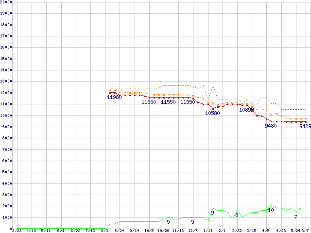 ※このグラフは過去のデータも税率5%相当に調整した税込み相当額のグラフです。 税率変更や、総額表示方式導入(2004年4月)の影響は除いています。 | | | ●凡例 | 最安値 (点線部は販売店未確認 または未調査) | 平均値 | 最高値 | ショップ数 |