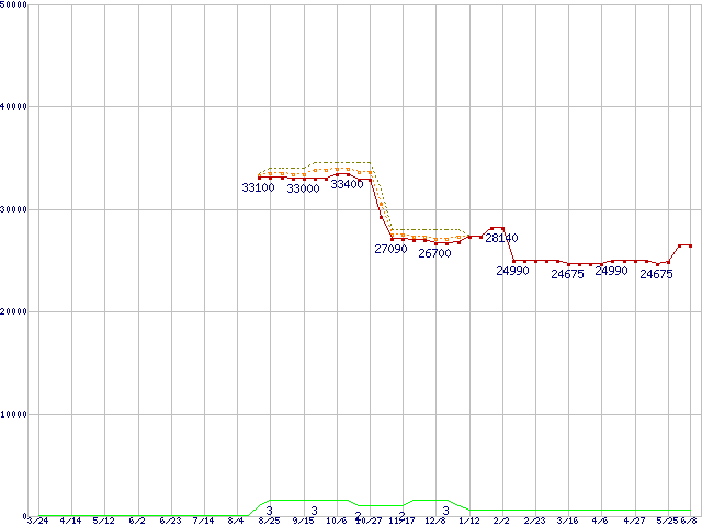 ※このグラフは過去のデータも税率5%相当に調整した税込み相当額のグラフです。 税率変更や、総額表示方式導入(2004年4月)の影響は除いています。 | | | ●凡例 | 最安値 (点線部は販売店未確認 または未調査) | 平均値 | 最高値 | ショップ数 |