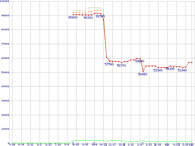 ※このグラフは過去のデータも税率5%相当に調整した税込み相当額のグラフです。 税率変更や、総額表示方式導入(2004年4月)の影響は除いています。 | | | ●凡例 | 最安値 (点線部は販売店未確認 または未調査) | 平均値 | 最高値 | ショップ数 |