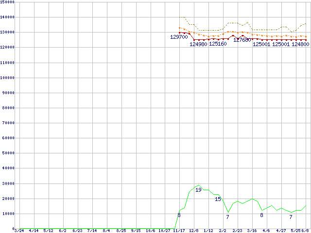 ※このグラフは過去のデータも税率5%相当に調整した税込み相当額のグラフです。 税率変更や、総額表示方式導入(2004年4月)の影響は除いています。 | | | ●凡例 | 最安値 (点線部は販売店未確認 または未調査) | 平均値 | 最高値 | ショップ数 |