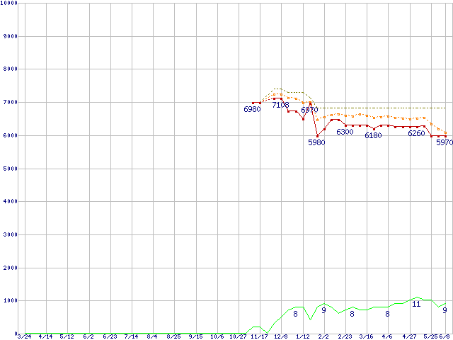 ※このグラフは過去のデータも税率5%相当に調整した税込み相当額のグラフです。 税率変更や、総額表示方式導入(2004年4月)の影響は除いています。 | | | ●凡例 | 最安値 (点線部は販売店未確認 または未調査) | 平均値 | 最高値 | ショップ数 |