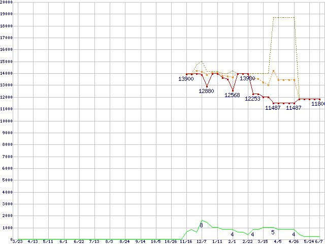 ※このグラフは過去のデータも税率5%相当に調整した税込み相当額のグラフです。 税率変更や、総額表示方式導入(2004年4月)の影響は除いています。 | | | ●凡例 | 最安値 (点線部は販売店未確認 または未調査) | 平均値 | 最高値 | ショップ数 |
