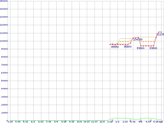 ※このグラフは過去のデータも税率5%相当に調整した税込み相当額のグラフです。 税率変更や、総額表示方式導入(2004年4月)の影響は除いています。 | | | ●凡例 | 最安値 (点線部は販売店未確認 または未調査) | 平均値 | 最高値 | ショップ数 |