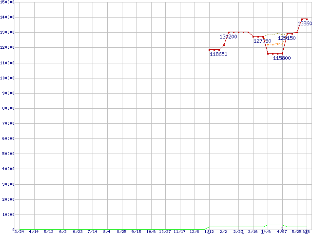 ※このグラフは過去のデータも税率5%相当に調整した税込み相当額のグラフです。 税率変更や、総額表示方式導入(2004年4月)の影響は除いています。 | | | ●凡例 | 最安値 (点線部は販売店未確認 または未調査) | 平均値 | 最高値 | ショップ数 |