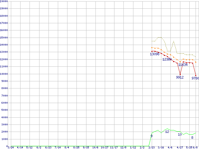 ※このグラフは過去のデータも税率5%相当に調整した税込み相当額のグラフです。 税率変更や、総額表示方式導入(2004年4月)の影響は除いています。 | | | ●凡例 | 最安値 (点線部は販売店未確認 または未調査) | 平均値 | 最高値 | ショップ数 |