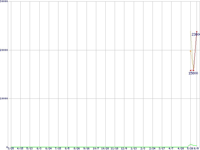 ※このグラフは過去のデータも税率5%相当に調整した税込み相当額のグラフです。 税率変更や、総額表示方式導入(2004年4月)の影響は除いています。 | | | ●凡例 | 最安値 (点線部は販売店未確認 または未調査) | 平均値 | 最高値 | ショップ数 |