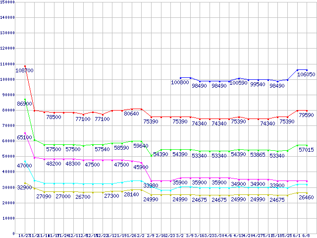 | Socket F (FSB 1000MHz,L2 1MBx2,Dual Core,TDP 95W)の最安値推移 | | | (2006年10月27日~2007年6月8日) |