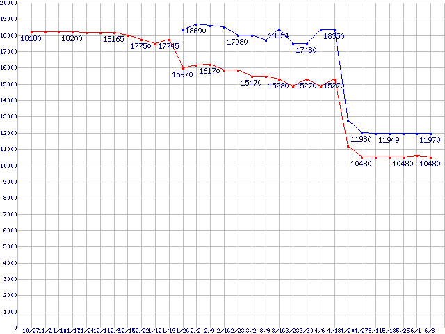| LGA775 (FSB 800MHz,L2 2MB×2,Dual Core,EM64T対応)の最安値推移 | | | (2006年10月27日~2007年6月8日) |