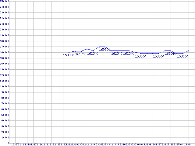 | LGA771(FSB 1333MHz,Quad Core,L2 4MB×2,TDP 120W)の最安値推移 | | | (2006年10月27日~2007年6月8日) |