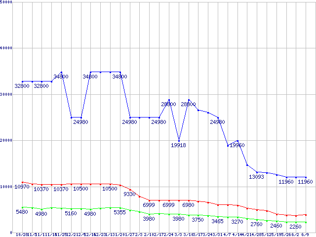 PC2-4200*(DDR2-533) DDR2 SDRAM DIMMの最安値推移