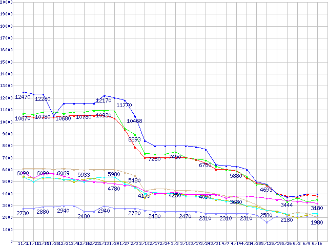 メモリ主要製品(最安値5千円未満)の最安値推移