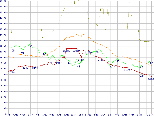 ※このグラフは過去のデータも税率5%相当に調整した税込み相当額のグラフです。 税率変更や、総額表示方式導入(2004年4月)の影響は除いています。 | | | ●凡例 | 最安値 (点線部は販売店未確認 または未調査) | 平均値 | 最高値 | ショップ数 |