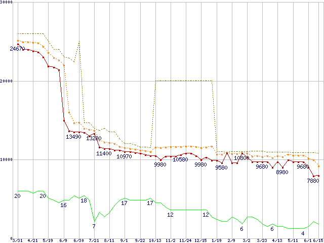 | Athlon 64 3500+ (2.2GHz,L2 512KB,Socket 939)の価格推移 | | | (2006年3月31日~2007年6月15日) |