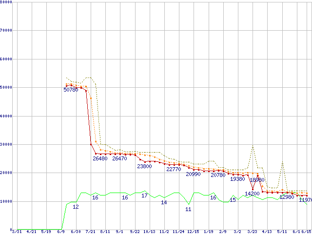 | Athlon 64 X2 4200+ (2.2GHz,L2 512KB×2,TDP65W)の価格推移 | | | (2006年3月31日~2007年6月15日) |