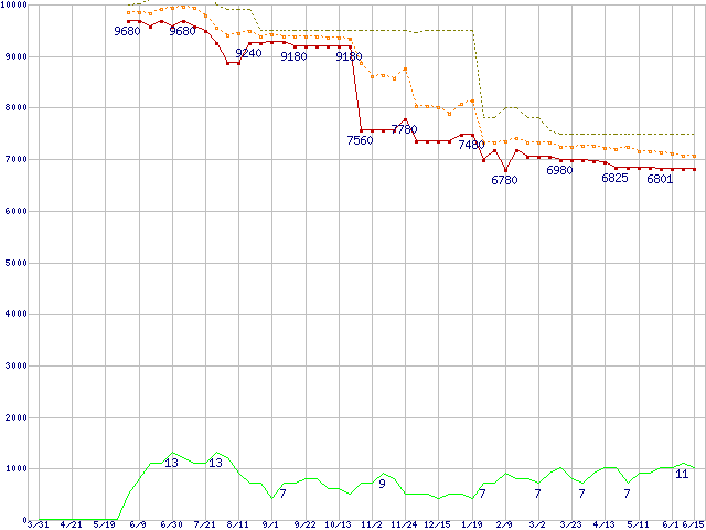 ※このグラフは過去のデータも税率5%相当に調整した税込み相当額のグラフです。 税率変更や、総額表示方式導入(2004年4月)の影響は除いています。 | | | ●凡例 | 最安値 (点線部は販売店未確認 または未調査) | 平均値 | 最高値 | ショップ数 |