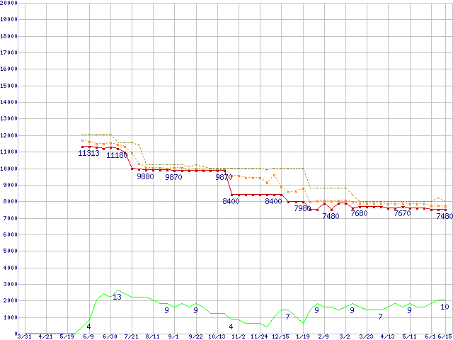 ※このグラフは過去のデータも税率5%相当に調整した税込み相当額のグラフです。 税率変更や、総額表示方式導入(2004年4月)の影響は除いています。 | | | ●凡例 | 最安値 (点線部は販売店未確認 または未調査) | 平均値 | 最高値 | ショップ数 |