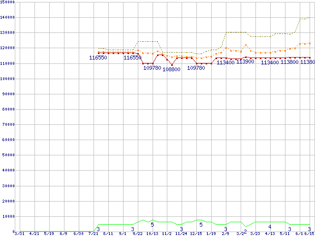 ※このグラフは過去のデータも税率5%相当に調整した税込み相当額のグラフです。 税率変更や、総額表示方式導入(2004年4月)の影響は除いています。 | | | ●凡例 | 最安値 (点線部は販売店未確認 または未調査) | 平均値 | 最高値 | ショップ数 |