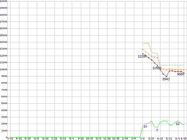 ※このグラフは過去のデータも税率5%相当に調整した税込み相当額のグラフです。 税率変更や、総額表示方式導入(2004年4月)の影響は除いています。 | | | ●凡例 | 最安値 (点線部は販売店未確認 または未調査) | 平均値 | 最高値 | ショップ数 |