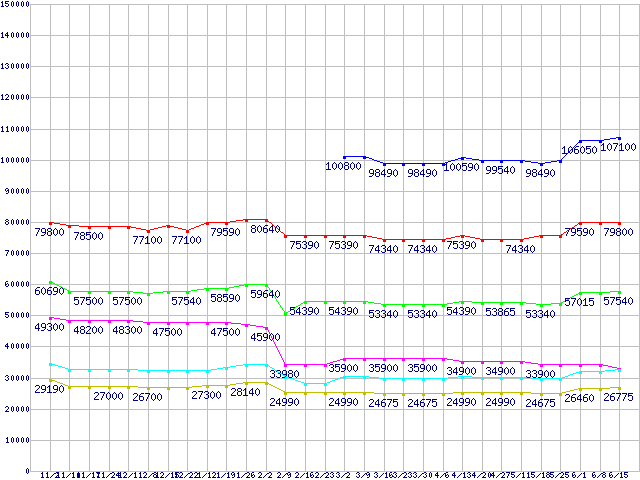 | Socket F (FSB 1000MHz,L2 1MBx2,Dual Core,TDP 95W)の最安値推移 | | | (2006年11月2日~2007年6月15日) |