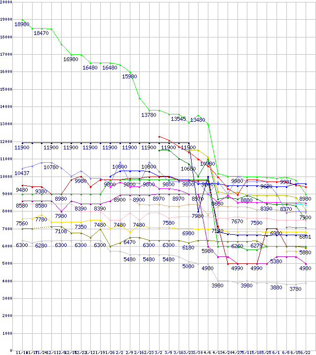 | CPU主要製品(最安値1万円未満)の最安値推移 | | | (2006年11月10日~2007年6月22日) |
