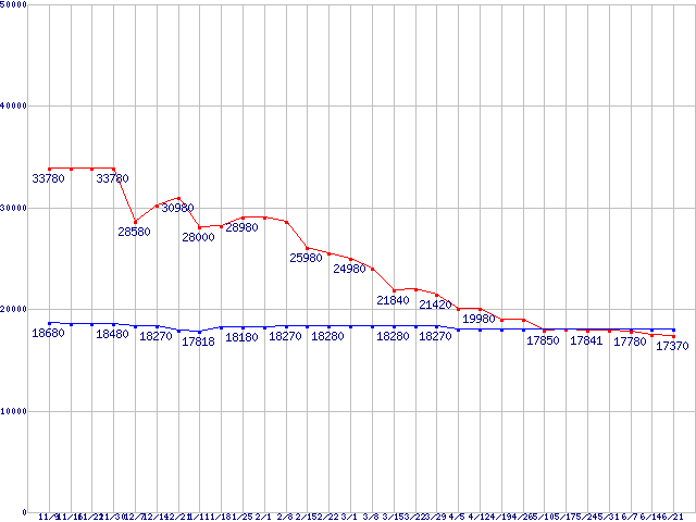 HDD主要製品(最安値1万5千円~2万円未満)の最安値推移