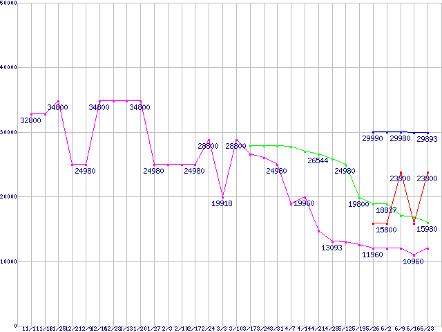 メモリ主要製品(最安値1万円以上)の最安値推移