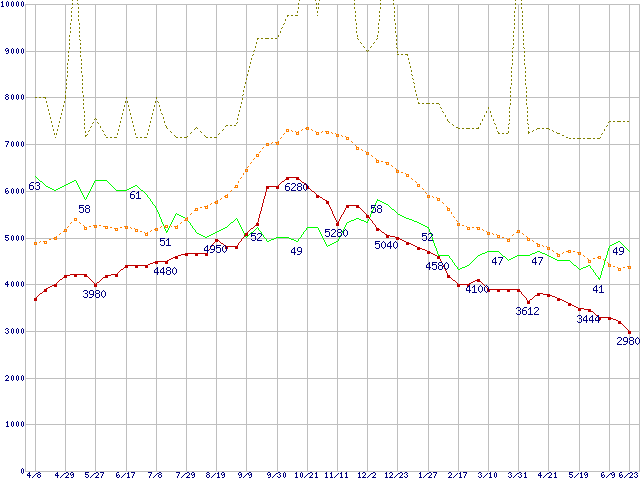 ※このグラフは過去のデータも税率5%相当に調整した税込み相当額のグラフです。 税率変更や、総額表示方式導入(2004年4月)の影響は除いています。 | | | ●凡例 | 最安値 (点線部は販売店未確認 または未調査) | 平均値 | 最高値 | ショップ数 |