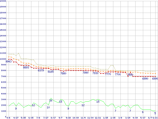 ※このグラフは過去のデータも税率5%相当に調整した税込み相当額のグラフです。 税率変更や、総額表示方式導入(2004年4月)の影響は除いています。 | | | ●凡例 | 最安値 (点線部は販売店未確認 または未調査) | 平均値 | 最高値 | ショップ数 |