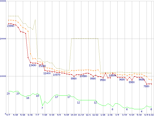 ※このグラフは過去のデータも税率5%相当に調整した税込み相当額のグラフです。 税率変更や、総額表示方式導入(2004年4月)の影響は除いています。 | | | ●凡例 | 最安値 (点線部は販売店未確認 または未調査) | 平均値 | 最高値 | ショップ数 |