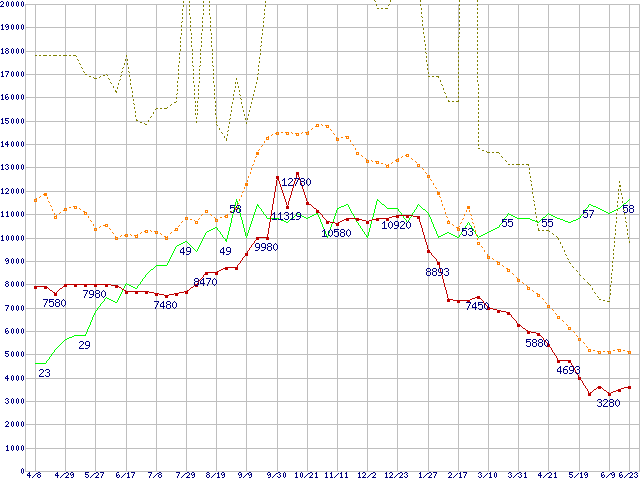 ※このグラフは過去のデータも税率5%相当に調整した税込み相当額のグラフです。 税率変更や、総額表示方式導入(2004年4月)の影響は除いています。 | | | ●凡例 | 最安値 (点線部は販売店未確認 または未調査) | 平均値 | 最高値 | ショップ数 |