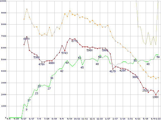 ※このグラフは過去のデータも税率5%相当に調整した税込み相当額のグラフです。 税率変更や、総額表示方式導入(2004年4月)の影響は除いています。 | | | ●凡例 | 最安値 (点線部は販売店未確認 または未調査) | 平均値 | 最高値 | ショップ数 |