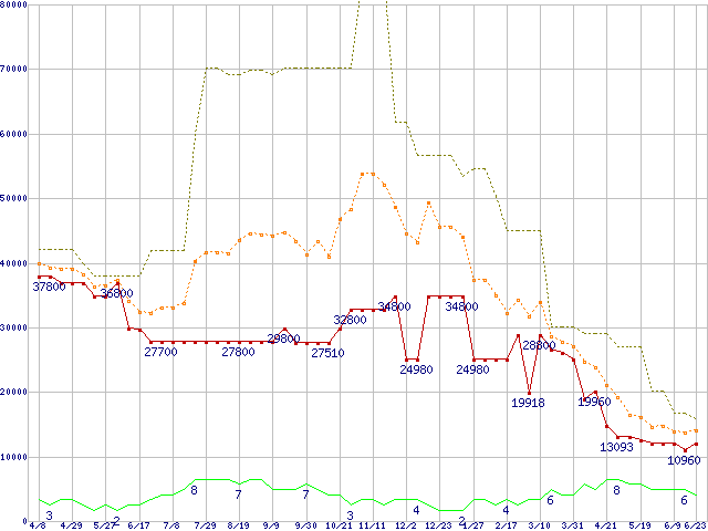 ※このグラフは過去のデータも税率5%相当に調整した税込み相当額のグラフです。 税率変更や、総額表示方式導入(2004年4月)の影響は除いています。 | | | ●凡例 | 最安値 (点線部は販売店未確認 または未調査) | 平均値 | 最高値 | ショップ数 |