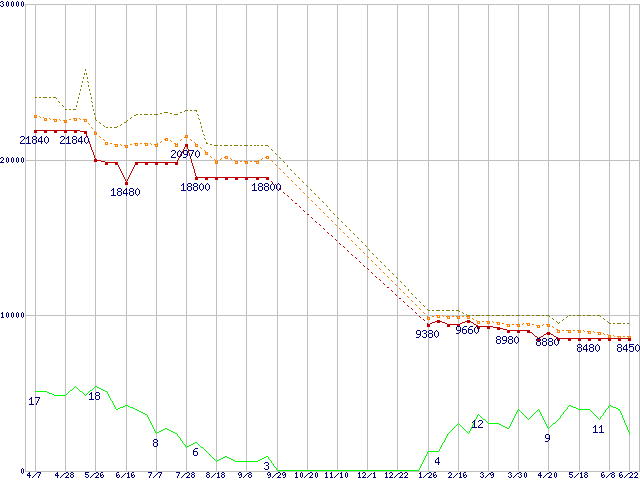 ※このグラフは過去のデータも税率5%相当に調整した税込み相当額のグラフです。 税率変更や、総額表示方式導入(2004年4月)の影響は除いています。 | | | ●凡例 | 最安値 (点線部は販売店未確認 または未調査) | 平均値 | 最高値 | ショップ数 |