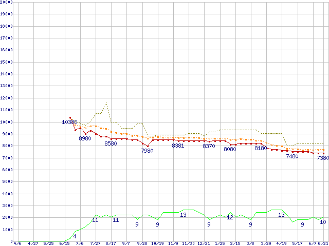 ※このグラフは過去のデータも税率5%相当に調整した税込み相当額のグラフです。 税率変更や、総額表示方式導入(2004年4月)の影響は除いています。 | | | ●凡例 | 最安値 (点線部は販売店未確認 または未調査) | 平均値 | 最高値 | ショップ数 |