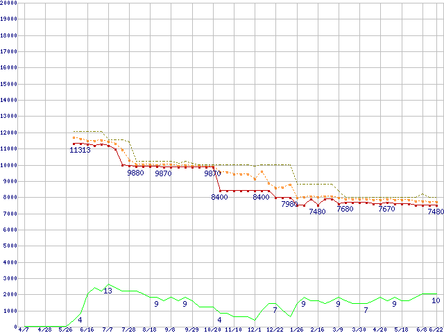※このグラフは過去のデータも税率5%相当に調整した税込み相当額のグラフです。 税率変更や、総額表示方式導入(2004年4月)の影響は除いています。 | | | ●凡例 | 最安値 (点線部は販売店未確認 または未調査) | 平均値 | 最高値 | ショップ数 |