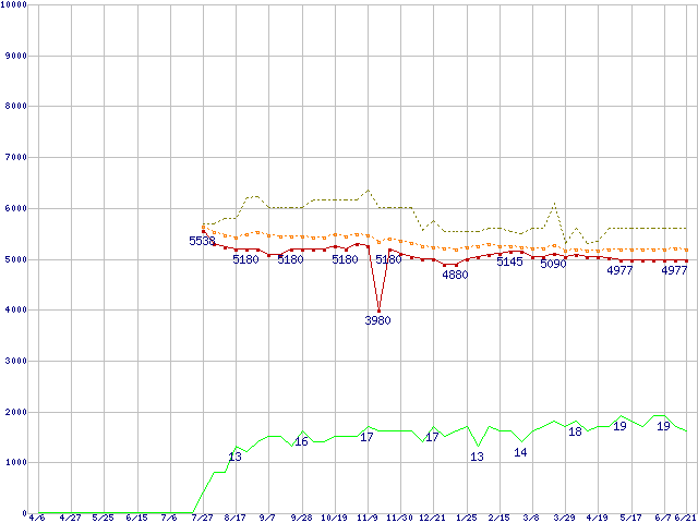 ※このグラフは過去のデータも税率5%相当に調整した税込み相当額のグラフです。 税率変更や、総額表示方式導入(2004年4月)の影響は除いています。 | | | ●凡例 | 最安値 (点線部は販売店未確認 または未調査) | 平均値 | 最高値 | ショップ数 |