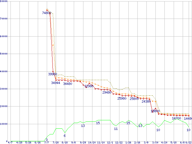 | Athlon 64 X2 4600+ (2.4GHz,L2 512KB×2,TDP65W)の価格推移 | | | (2006年4月7日~2007年6月22日) |