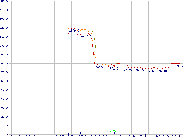 ※このグラフは過去のデータも税率5%相当に調整した税込み相当額のグラフです。 税率変更や、総額表示方式導入(2004年4月)の影響は除いています。 | | | ●凡例 | 最安値 (点線部は販売店未確認 または未調査) | 平均値 | 最高値 | ショップ数 |